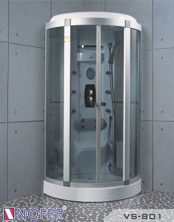 - Phòng tắm xông hơi Nofer VS – 801 được thiết kế để đặt góc với kích thước nhỏ 950 x 950 x 2150mm ứng với hai cạnh góc và chiều cao. Đây là phòng xông hơi có dạng đế thấp. Chất liệu chính tạo lên phần đế và vách phía sau của phòng xông hơi này là nhựa Acrylic Ngọc Trai. Kính chắn cường lực dày 8 mm được gắn kết với nhau nhờ nẹp nhôm chắc chắn. Những chất liệu này đều có khả năng chống ố vàng, chống bám bẩn tốt nhất. Cửa của cabin tắm Nofer VS – 801 là dạng cửa lùa hai bên, tiết kiệm diện tích phòng tắm và thuận tiện cho người dùng.